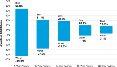 Source: Schwab Center for Financial Research with data provided by Standard and Poor's. Every 1-, 3-, 5-, 10-, and 20-year rolling calendar period for the S&P 500 Index was analyzed from 1926 through 2019. The highest and lowest annual total returns for the specified rolling time periods were chosen to depict the volatility of the market. Returns include reinvestment of dividends. Indices are unmanaged, do not incur fees or expenses, and cannot be invested in directly. For additional information, please see Schwab.com/IndexDefinitions. Past performance is no guarantee of future results. Diversification strategies do not ensure a profit and do not protect against losses in declining markets.