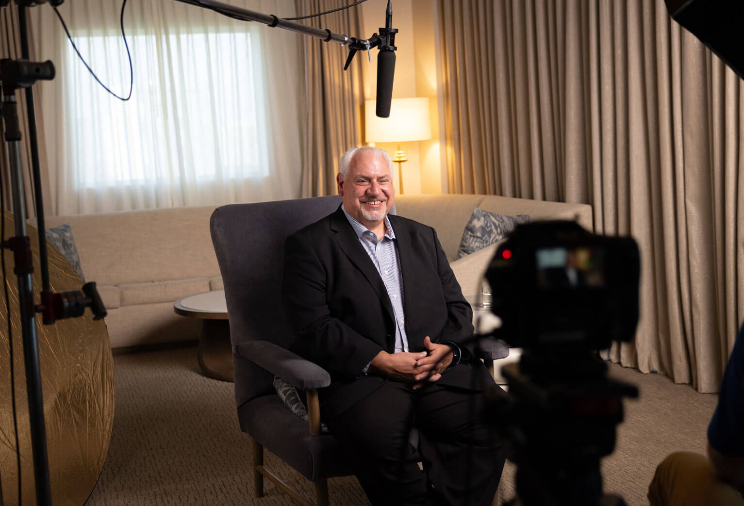 Throughout the video, the speaker (Ben Watson) appears sitting in an armchair in a relaxed setting, smiling and laughing, talking to colleagues, and speaking on stage.