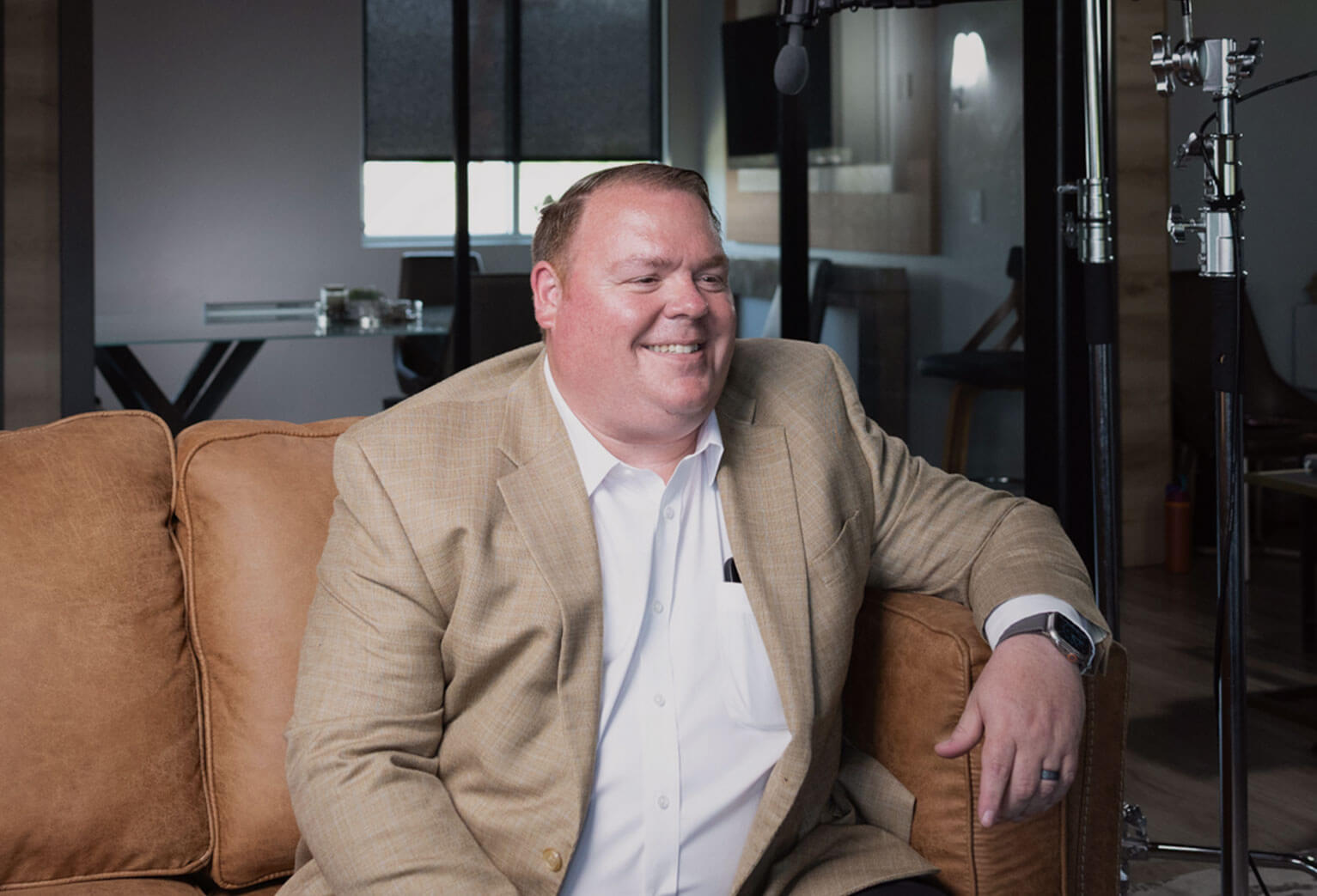 Throughout the video, the speaker (James Boyd) appears sitting on a sofa in an office, smiling and laughing and standing indoors next to a set of stairs, smiling while looking at the camera.