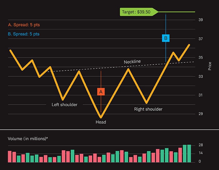 An interesting feature of inverse head-and-shoulders patterns is that they can be used to estimate a profit target after the pattern is complete (chart below). To determine the target spread: